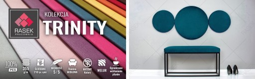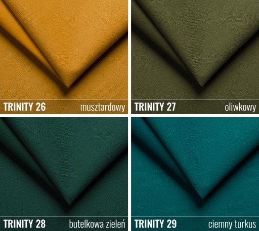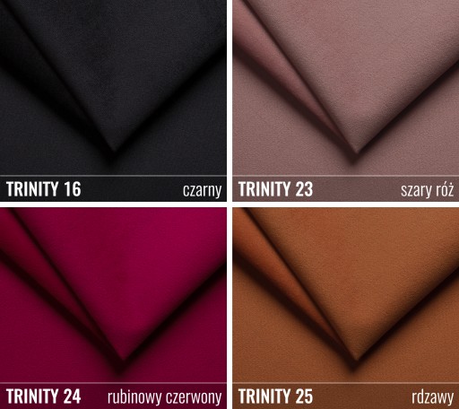 Tkanina TRINITY - popularna welurowa tkanina obiciowa. Jej cechą charakterystyczną jest delikatna struktura i powierzchnia pokryta drobnym meszkiem - w dotyku miękka i przyjemna. Cieszy się popularnością ze względu na subtelne, cieniowanie materiału oraz matowe kolory. Odporna na ścieranie i pilling oraz na działanie światła! Tkanina posiada właściwości ograniczonego wchłaniania płynów co wpływa pozytywnie na utrzymanie jej w czystości.