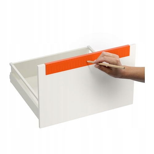 - Pasek na szablonie do wiercenia należy przyłożyć równo z krawędzią drzwi lub przedniej ściany szuflady. Szablon pomoże Ci umieścić uchwyt doskonale prosto – w poziomie lub w pionie.