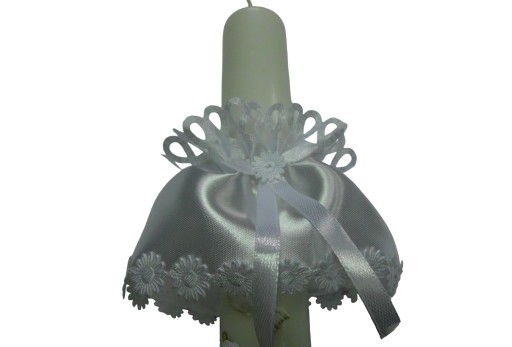 Przedmiotem sprzedaży jest profitka (ozdoba) na świecę wykonana z białej satynowej taśmy . Profitka z białym kotylionem, marszczona gumką.