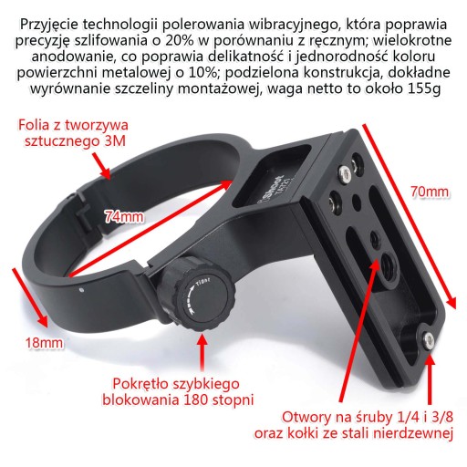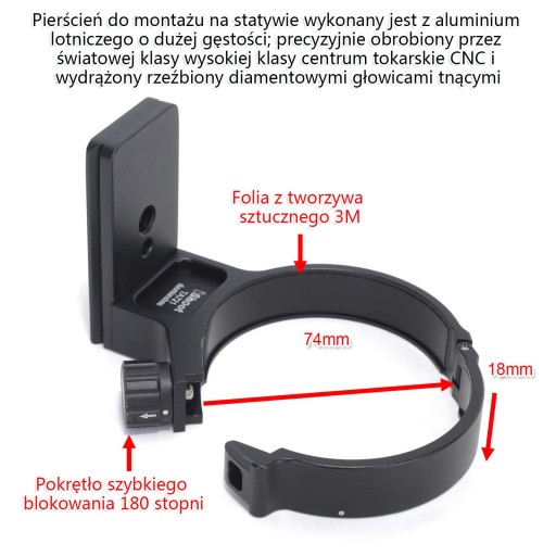 Pierścień do montażu na statywie wykonany jest z aluminium lotniczego o dużej gęstości; precyzyjnie obrobiony przez światowej klasy wysokiej klasy centrum tokarskie CNC i wydrążony rzeźbiony diamentowymi głowicami tnącymi;