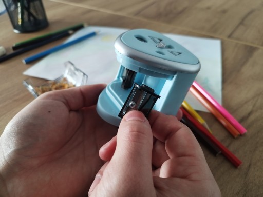 ✅ Temperówka posiada blokadę która nie włączy urządzenia po wyjęciu pojemnika na strużyny.