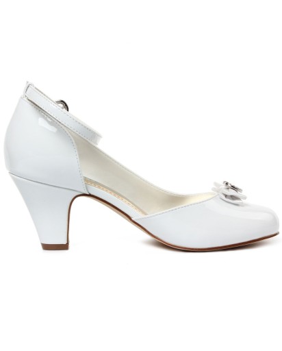 Buciki wykonane z białej lakierowanej skóry ekologicznej , ozdobione kokardką z serduszkiem z cyrkoniami..