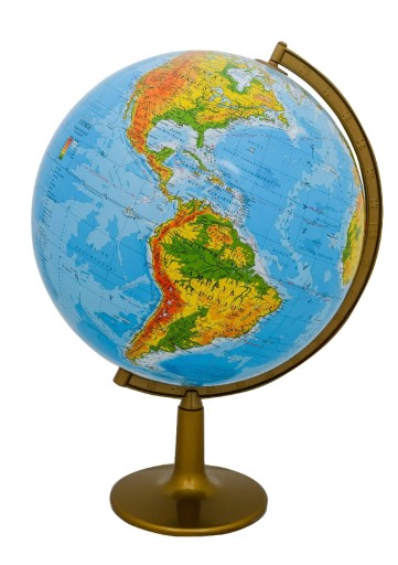 Globus fizyczny o średnicy 42 cm w skali 1:30 000 000. Podstawa plastikowa, cięciwa aluminiowa.