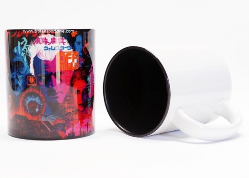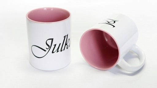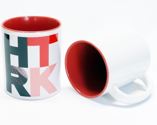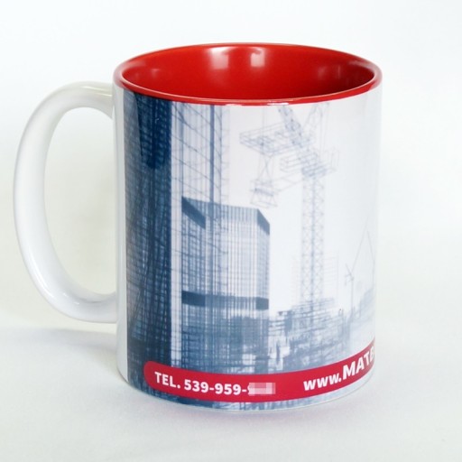 Kubek ceramiczny z nadrukiem kolorowym, w którym nie musi być górnego i dolnego marginesu.