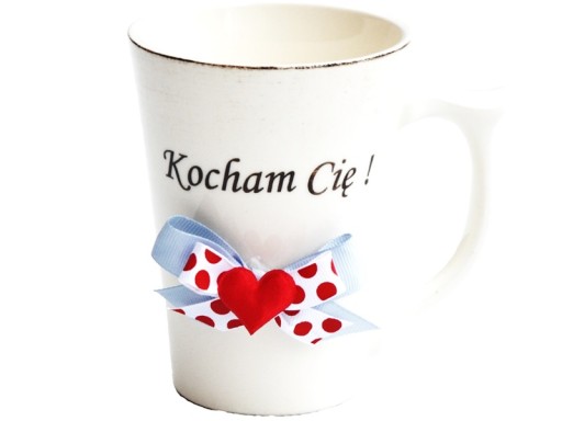 - wysokiej jakości PORCELANOWY KUBKEK z Manufaktury Chodzieskiej o pojemności 400 ml z ręcznie wykonanym napisem: Kocham Cię,
