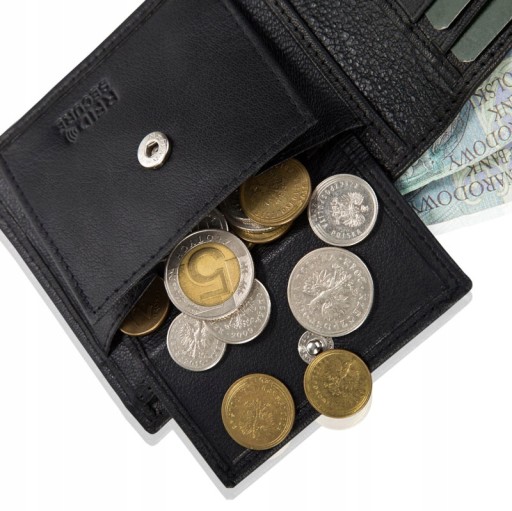 Banknoty schowamy do 2 szerokich, otwartych kieszeni. Natomiast bilon do 1 kieszonki zamykanej na mocny nap.