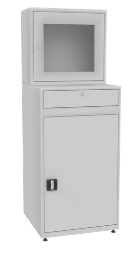 Górna przeszklona część pozwala na umieszczenie monitora LCD o rozmiarach do 23". Front został wykonany została ze szkła hartowanego. Dolna część szafy służy do bezpiecznego przechowywania jednostki PC oraz innych urządzeń towarzyszących. Znajduje się w niej półka przesuwna co 25 mm.