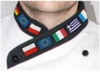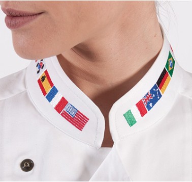 Wszystkie bluzy kucharskie oferowane na naszych aukcja (w każdym kolorze i gatunku materiału) mogą mieć wykonaną stójkę haftowaną flagami różnych państw.