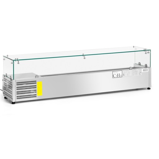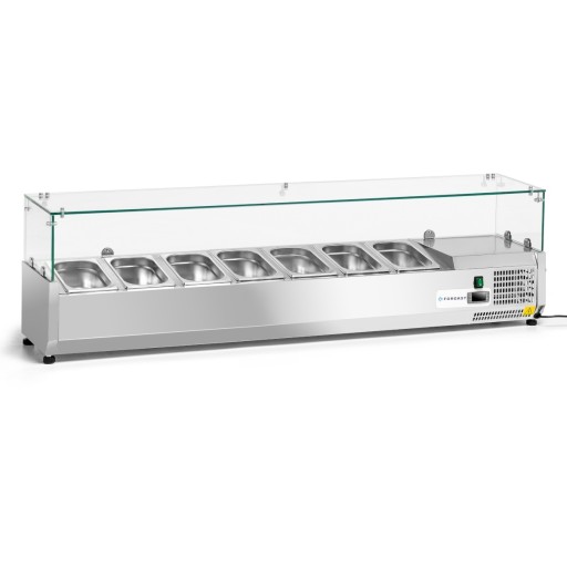 Pojemność - 7 pojemników GN 1/4. Elektroniczny termostat i cyfrowy wyświetlacz temperatury Dixell. Komora chłodnicza na pojemniki GN o maksymalnej głębokości 10 cm. Urządzenie dostosowane do pracy w warunkach o temperaturze do +30 ºC.