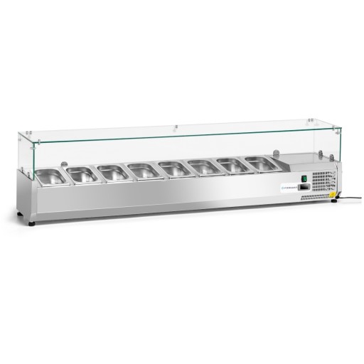 Pojemność - 9 pojemników GN 1/4. Elektroniczny termostat i cyfrowy wyświetlacz temperatury Dixell. Komora chłodnicza na pojemniki GN o maksymalnej głębokości 10 cm. Urządzenie dostosowane do pracy w warunkach o temperaturze do +30 ºC.