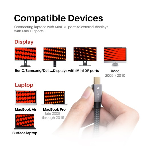 - Kompatybilny z MacBookiem Pro (modele od końca 2008 do połowy 2015), MacBook Air (modele od końca 2008 do połowy 2017), iMac (modele 2009-2010), Microsoft Surface, ThinkPad, Dell XPS, Asus i inne laptopy z Mini-DP portu.