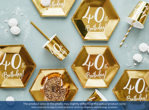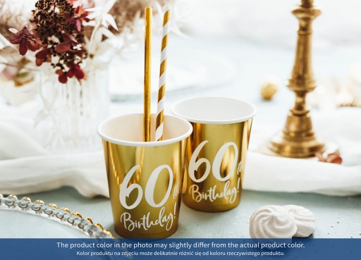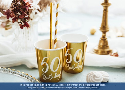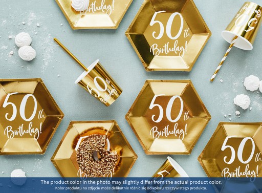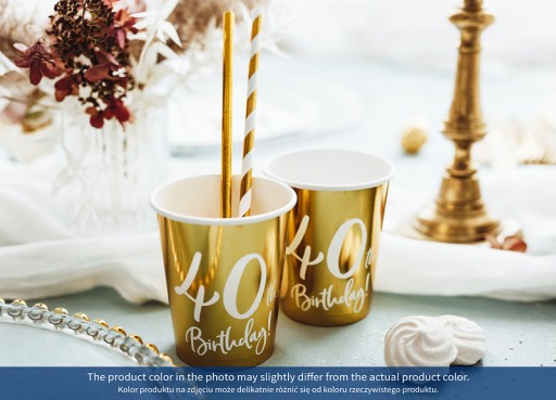 Kubeczki papierowe w kolorze złotym metalizowanym z białym napisem ...Birthday!,