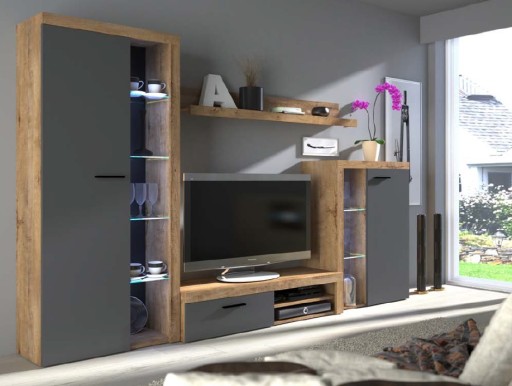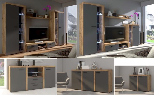 Komoda 3D 148 cm z systemu Rumba wykonana z płyty laminowanej o podwyższonej wytrzymałości w kolorze dąb lefkas korpus a drzwi w kolorze grafit .