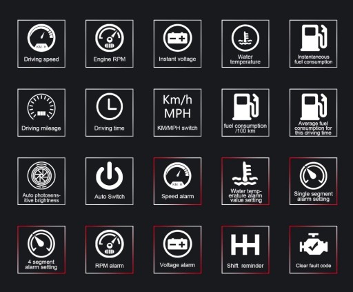 - Funkcje alarmu: przekroczenie prędkości, wysoka temperatura, niskie napięcie akumulatora, czas na odpoczynek po 4 godzinach jazdy, niska prędkość przy wysokich obrotach silnika