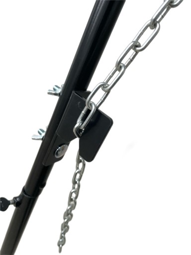Trójnóg wykonany z mocnej rury 20mm o grubości aż 2,00mm, jest pomalowany farbą proszkową na kolor RAL 9005. Rolka z ozdobną falbanką jest wykonany za pomocą nowoczesnych maszyn CNC pozwala na płynne podnoszenie oraz opuszczanie zawieszonego rusztu bądź kociołka. Mocne łańcuchy utrzymują bezpiecznie całość nad rozgrzanym żarem.