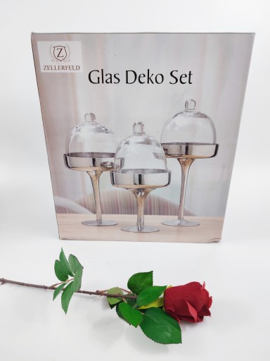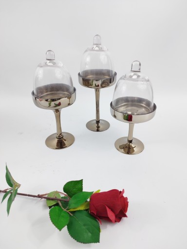 Świeczniki wykonane są ze szkła w kolorze srebrno - szarym oraz bezbarwne pokrywy.