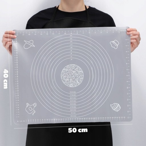 Na brzegach maty umieszczono podziałkę centymetrową (0-38cm) krótszy brzeg i (0-48cm) dłuższy brzeg. Dodatkowa podziałka centymetrowa zaczynająca się od środka - pomoże wyrobić np. placek ciasta do pizzy o odpowiedniej średnicy.