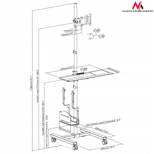- Profesjonalny stand wózek mobilne stanowisko komputerowe na kółkach Maclean MC-793 max 20kg max 17"-32"