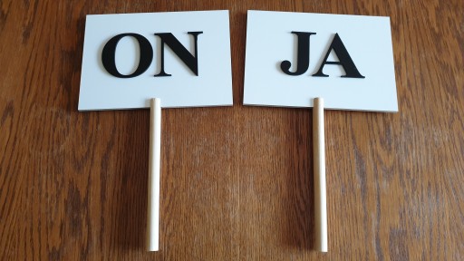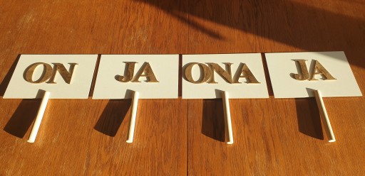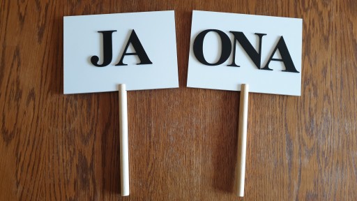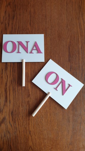Zestaw składa się z 4 tabliczek na których znajdują się napisy: JA, JA, ON, ONA.