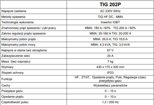 - Instrukcja obsługi w języku polskim całej spawarki oraz wszystkich funkcji