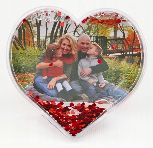 Gdy potrząśniesz wodną ramką, wokół Twojego zdjęcia będą unosiły się kolorowe płatki, serduszka lub śnieg (w naszej ofercie dostępne są różne wypełnienia)