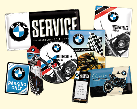Metalowy pojemnik z malunkiem BMW MOTOR na całej powierzchni.