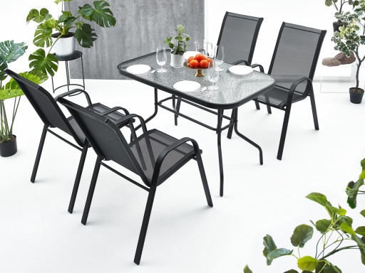 ZESTAW MEBLI OGRODOWYCH idealny do Twojego ogrodu. Stelaż został podwójnie lakierowany proszkowo, co idealnie przystosowuje ten produkt to zastosowania wewnątrz jak i na zewnątrz. Siedzisko krzesła oraz oparcie zostało zrobione z czarnego, elastycznego obicia tekstylnego tak, aby maksymalnie zwiększyć wygodę. Posiada ono dwa oparcia boczne. Użyte materiały nie wymagają częstej konserwacji, są odporne na warunki pogodowe i nie wymagają specjalnych środków do pielęgnacji. Nóżki są dodatkowo zaopatrzone w nakładki z tworzywa sztucznego.Stół posiada blat z przezroczystej hartowanej szyby.