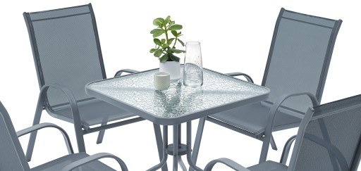 ZESTAW MEBLI OGRODOWYCH idealny do Twojego ogrodu. Stelaż został podwójnie lakierowany proszkowo, co idealnie przystosowuje ten produkt to zastosowania wewnątrz jak i na zewnątrz. Siedzisko krzesła oraz oparcie zostało zrobione z szarego, elastycznego obicia tekstylnego tak, aby maksymalnie zwiększyć wygodę. Posiada ono dwa oparcia boczne. Użyte materiały nie wymagają częstej konserwacji, są odporne na warunki pogodowe i nie wymagają specjalnych środków do pielęgnacji. Nóżki są dodatkowo zaopatrzone w nakładki z tworzywa sztucznego. Stół posiada blat z przezroczystej hartowanej szyby o gr. 5 mm.