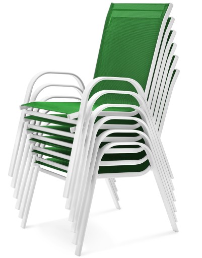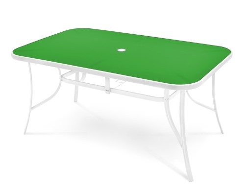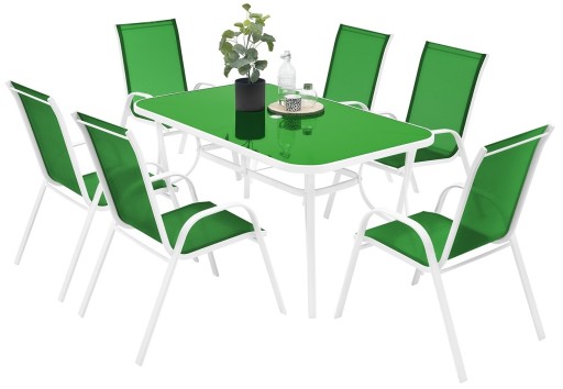 ZESTAW MEBLI OGRODOWYCH idealny do Twojego ogrodu. Stelaż został podwójnie lakierowany proszkowo, co idealnie przystosowuje ten produkt to zastosowania wewnątrz jak i na zewnątrz. Siedzisko krzesła oraz oparcie zostało zrobione z zielonego, elastycznego obicia tekstylnego tak, aby maksymalnie zwiększyć wygodę. Posiada ono dwa oparcia boczne. Użyte materiały nie wymagają częstej konserwacji, są odporne na warunki pogodowe i nie wymagają specjalnych środków do pielęgnacji. Nóżki są dodatkowo zaopatrzone w nakładki z tworzywa sztucznego.Stół posiada blat z zielonej hartowanej szyby o gr. 5 mm, z otworem na wstawienie parasola ogrodowego.