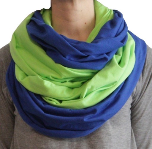 Tym razem proponujemy komin z miłej, niezbyt grubej (150 g/m2) dzianiny bawełninej (1008%). Waściwie są to dwa kominy nie zszyte razem, dzięki temu można układać je różnorodnie, a nawet nosić pojedyńczo lub połączyć za każdym razem z innymi kolorami.