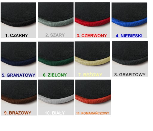 Obszycie dywaników może być wykonane w różnych kolorach: