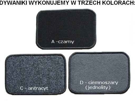 Po dokonaniu zakupu proszę w wiadomości do sprzedającego lub w mailu podać: Kolor wybranej wykładziny, kolor obszycia dywaników i rodzaj wzmocnienia dywanika kierowcy. Jeżeli nie otrzymamy takich informacji to wyślemy dywaniki z czarnej (A) wykładziny i z czarnym obszyciem.