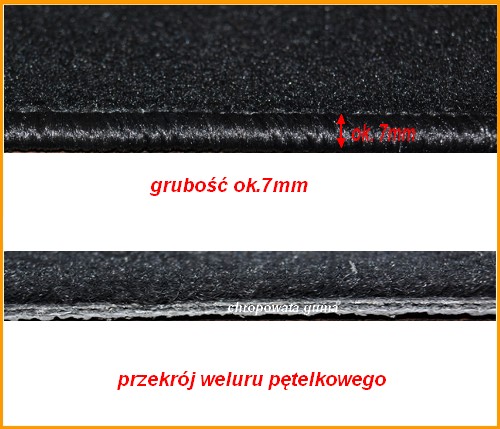 Dywaniki wykonane są z weluru pętelkowego o grubości około 7mm
