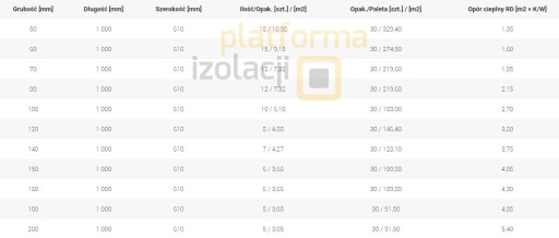 - Dostępne grubości w mm: 50, 60, 75, 80, 100, 120, 140, 150, 160, 180, 200