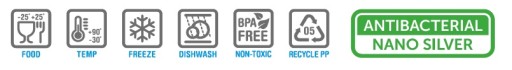 Mikrocząstki srebra, poprzez swoje bakteriobójcze działanie zapobiegają przenoszeniu bakterii podczas użytkowania pojemnika. Skuteczność mikrosrebra jest niemal 100% i powoduje zahamowanie rozwoju bakterii i grzybów, to krok do przodu w drodze do zdrowia.