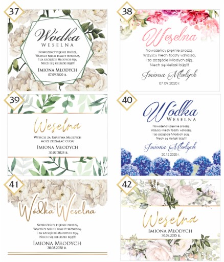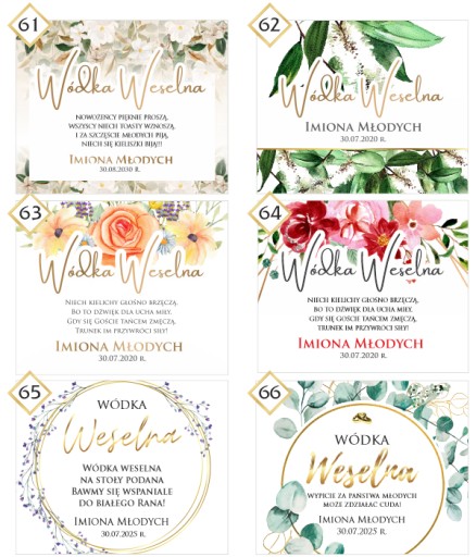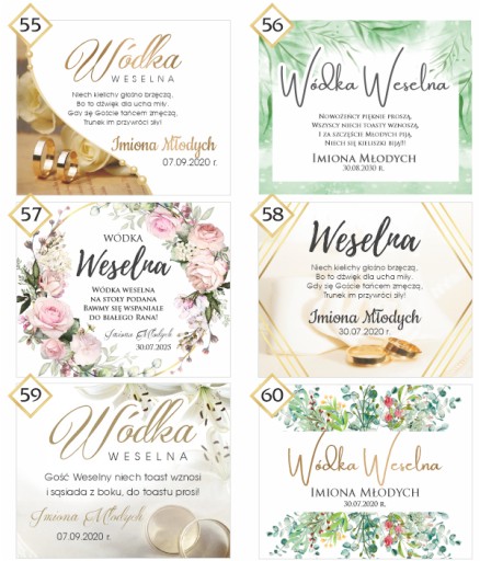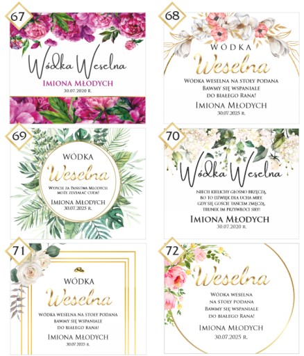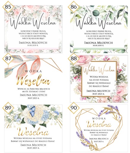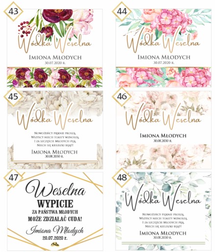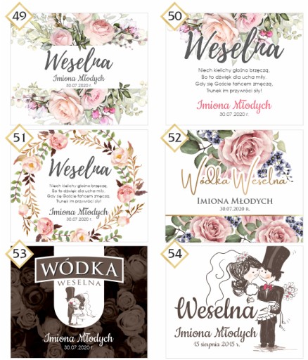 Naklejki na wódkę Biały Bocian o pojemności 0,5l z imionami i datą ślubu Młodej Pary. Naklejki drukowane cyfrowo na folii, co gwarantuje doskonałą jakość wydruku oraz odporność na chłodzenie w lodówce, zamrażarce, chłodni itp., innymi słowy naklejka nie rozpływa, odkleja się od butelki po wyjęciu z zamrażarki i podaniu na stół weselny. Wymiar naklejki : 105 x 85 mm. W każdym wzorze jest możliwość dodania indywidualnego wierszyka, zmiany czcionki, zmiany koloru czcionki, zmiany napisu Wódka Weselna np. na Starostówka ... Jeśli posiadają Państwo własny projekt chętnie go dla Państwa wydrukujemy nie wpływa to na dodatkowe koszty. Możemy przygotować indywidualny projekt który jest GRATISOWY. Przy zamówienie 1 kompletu naklejek mają Państwo do wyboru jeden wzór, przy 2 kompletach 2 wzory... itp. W razie jakichkolwiek pytań proszę pisać.