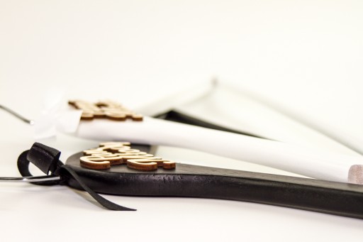 Zestaw składa się z 2 drewnianych wieszaków - białego z napisem "Panna Młoda" oraz czarnego z napisem "Pan Młody". Napisy na wieszakach są wykonane ze sklejki.