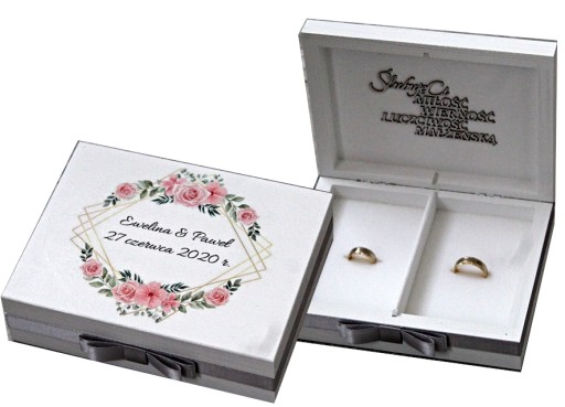 Pudełko na obrączki pomalowane na kolor biały z imionami oraz datą Ślubu. Ozdobione srebrną lub złotą wstążką, naniesionymi na pudełko różami oraz napisem w środku. W skład pudełka wchodzi również wypełnienie w środku do stabilnego i eleganckiego umieszczenia obrączek w kolorze białym.
