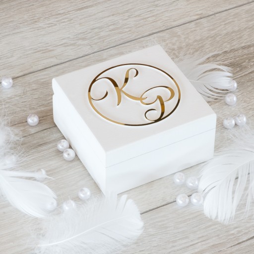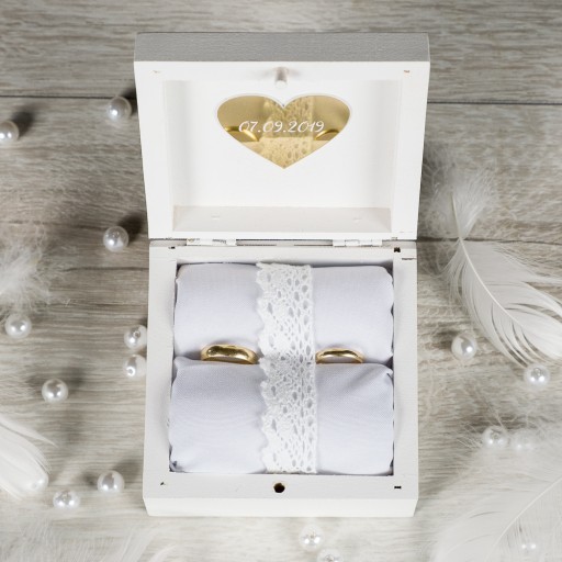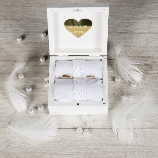Element wykonany z lustrzanej pleksi prezentuje się szykownie i z klasą. Takie pudełeczko idealnie pasuje do wesela w stylu boho, glamour i nie tylko. Białe drewniane pudełko na obrączki z wysokiej jakości wykończeniem lustrzanym z personalizacją.