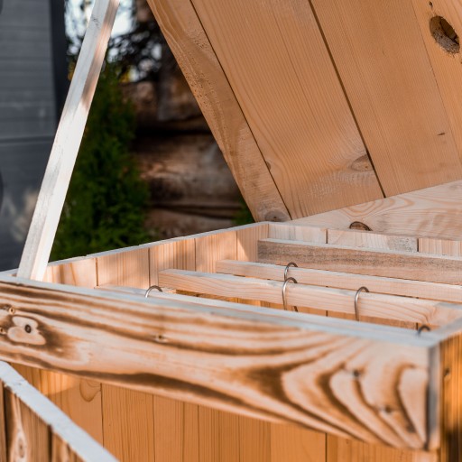 - Wszystkie elementy po zakończonym wędzeniu mieszczą się w drewnianej komorze wędzarniczej. Zapewnia to mobilność wędzarni.