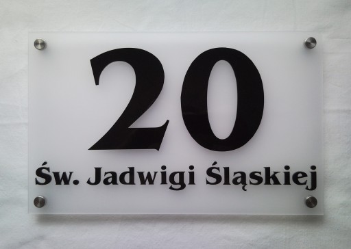 Istnieje również możliwość wykonania tabliczki na szkle akrylowym w kolorze "szkło mrożone" w rozmiarach np.