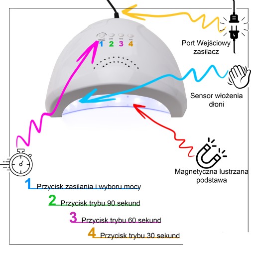 - Posiada tryb zmniejszonego ogrzewania, który redukuje efekt pieczenia płytki paznokcia podczas utwardzania żelem