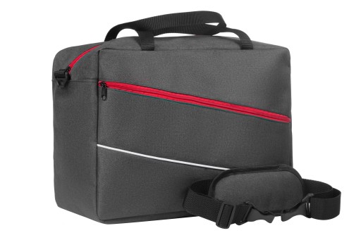 Tył torby wyposażony jest w dodatkowy pas przeznaczony na rączkę dla walizki.