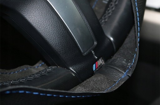 1. Nałożyć pokrowiec na kierownice w taki sposób aby łączenie skóry, znalazło się na dole i na środku kierownicy. Pokrowiec obszywamy od ramienia do ramienia, na początku należy odmierzyć odpowiednią długość załączonej do zestawu nitki. Mniej więcej jest to dwa razy tyle ile ma odcinek do obszycia, czyli od ramienia do ramienia.