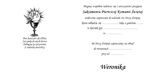 Przedmiotem oferty są Zaproszenia na I Komunię Świętą formatu 15/15cm