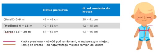 - 6-18 miesięcy (M) – 50 cm w klatce piersiowej, długość od ramienia do krocza 42 cm