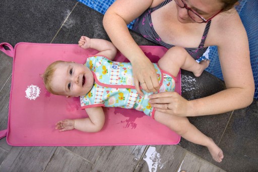 Pianka do wody Baby Wrap otwiera się i rozkłada w całości, co ułatwia ubieranie i dopasowywanie. Dzięki temu unikniesz awantur w przebieralni.