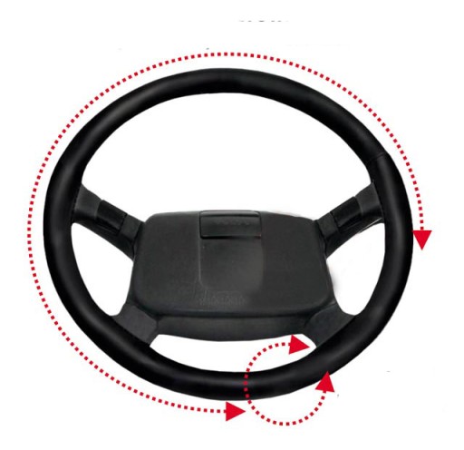 Nałożyć pokrowiec na kierownice w taki sposób aby łączenie skóry, znalazło się na dole i na środku kierownicy.