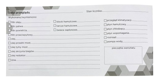miejsce na podstawowe dane samochodu, nazwisko właściciela i nr telefonu.