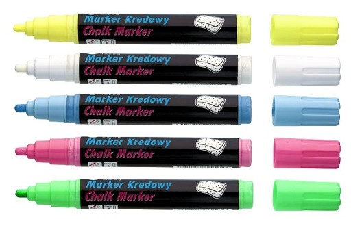 Markery z płynną kredą, do pisania po tablicach czarnych, białych, po szkle i powierzchniach plastikowych.